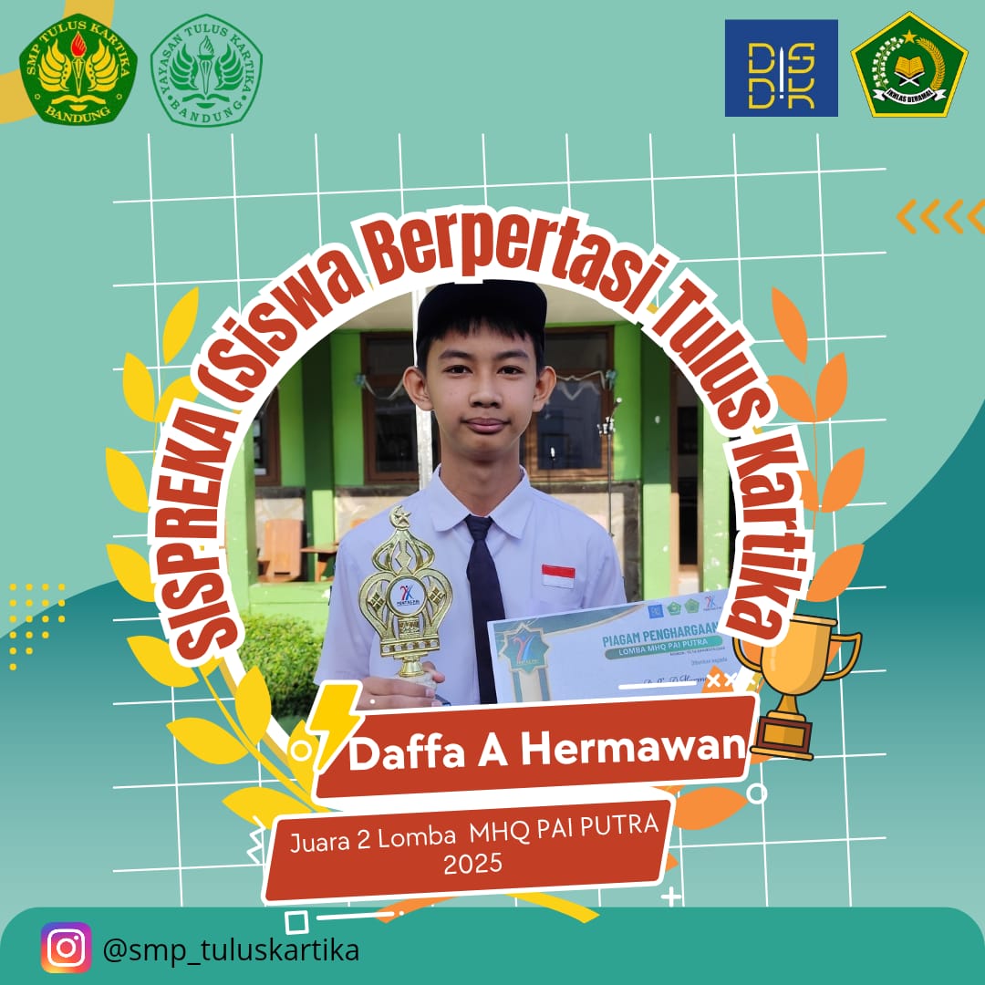 Alhamdulillah siswa SMP Tulus Kartika kembali meraih prestasi. Prestasi yang diraih kali ini adalah pentas PAI wilayah Bandung Selatan. Lomba ini di adakan setiap tahunnya, jika meraih juara 1 akan mengikuti lomba di tingkat kota.