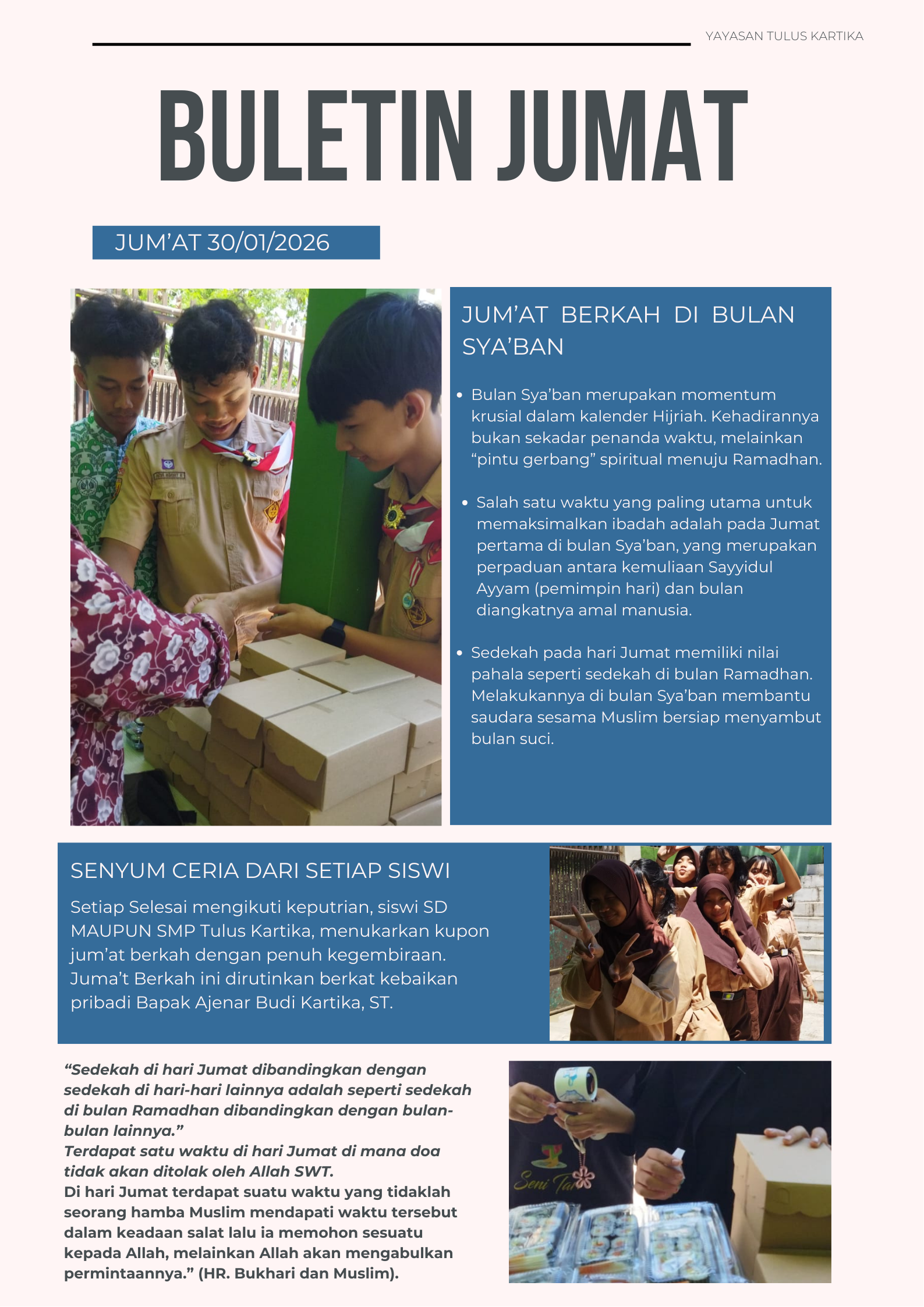 Senyum ceria Siswa Siswi SD dan SMP Tulus Kartika Menyambut Kegiatan Jum’at Berkah.
