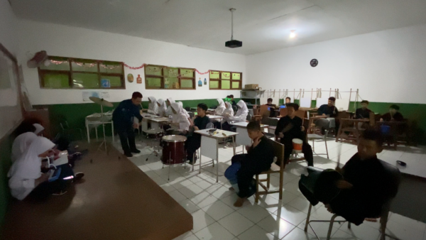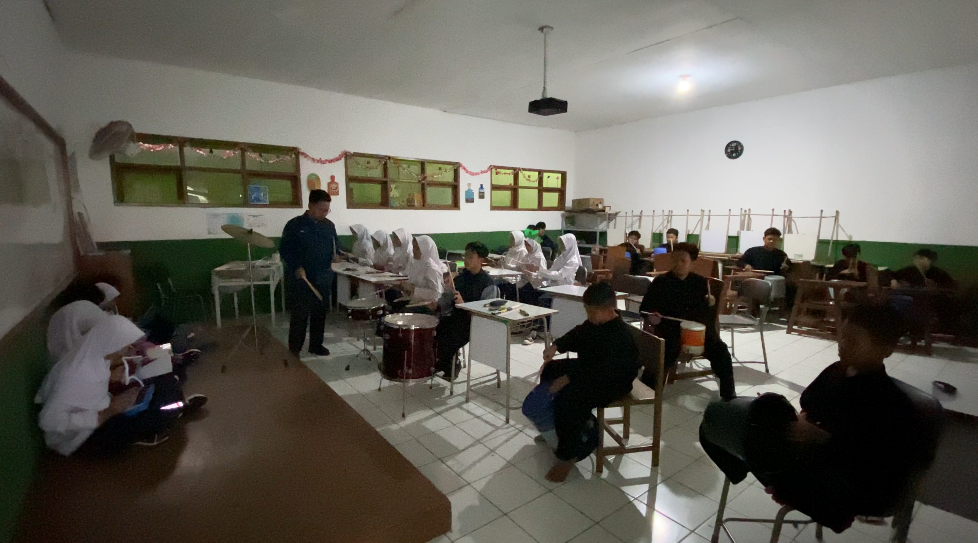 Ekstrakulikuler Marching Band SMP Tulus Kartika berlatih Ritmis dan Melodis pada Lagu Maju Tak Gentar dengan menggunakan alat musik seadanya tetapi harmonisasi tetap terjaga.
