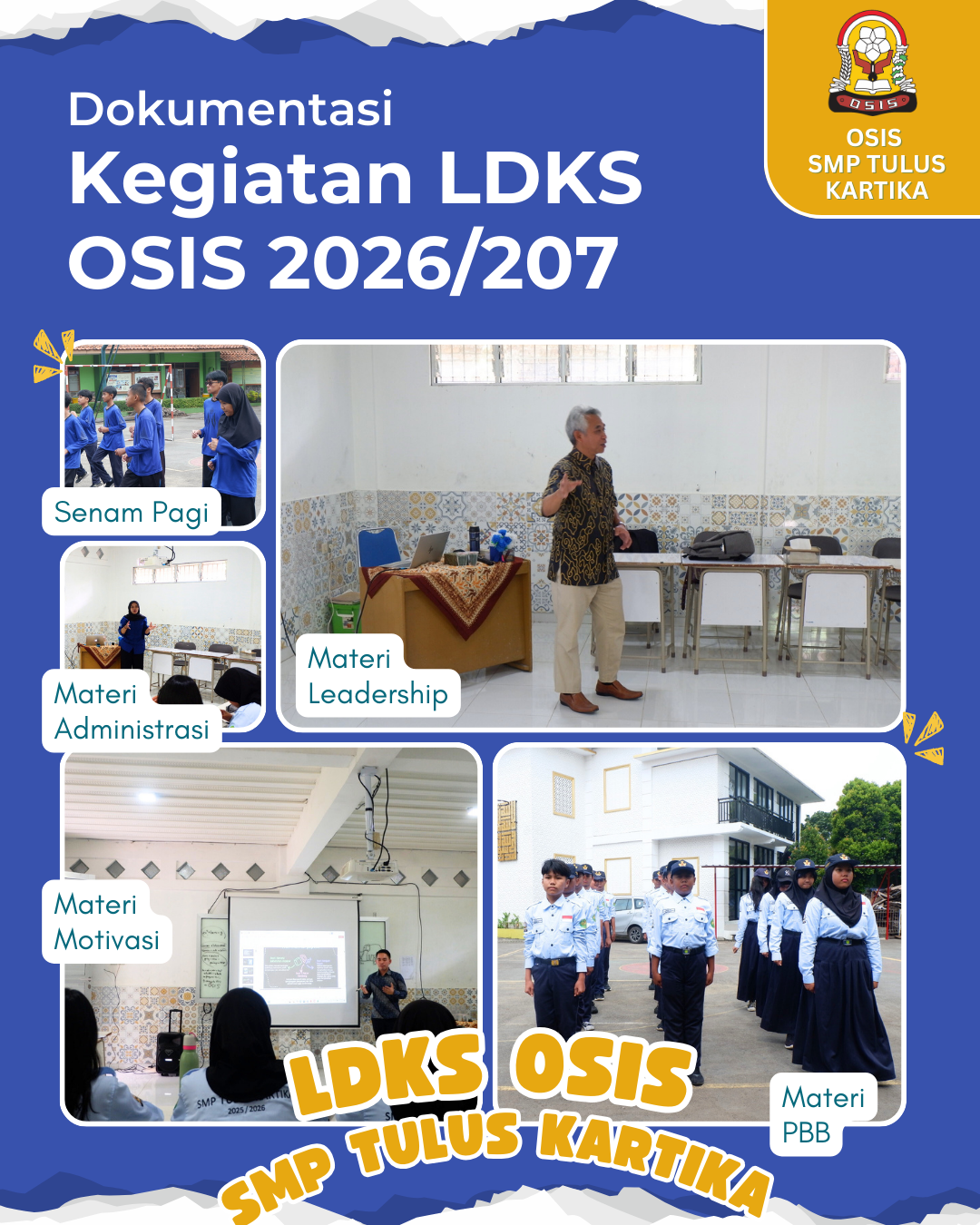 Kegiatan Latihan Dasar Kepemimpinan Siswa (LDKS) OSIS SMP Tulus Kartika Periode 2026/2027 telah dilaksanakan pada Sabtu, 7 Februari 2026. Kegiatan ini bertujuan untuk membekali pengurus OSIS dengan pengetahuan, sikap, dan keterampilan dasar kepemimpinan sebagai bekal dalam menjalankan tugas dan tanggung jawab organisasi selama satu periode ke depan.